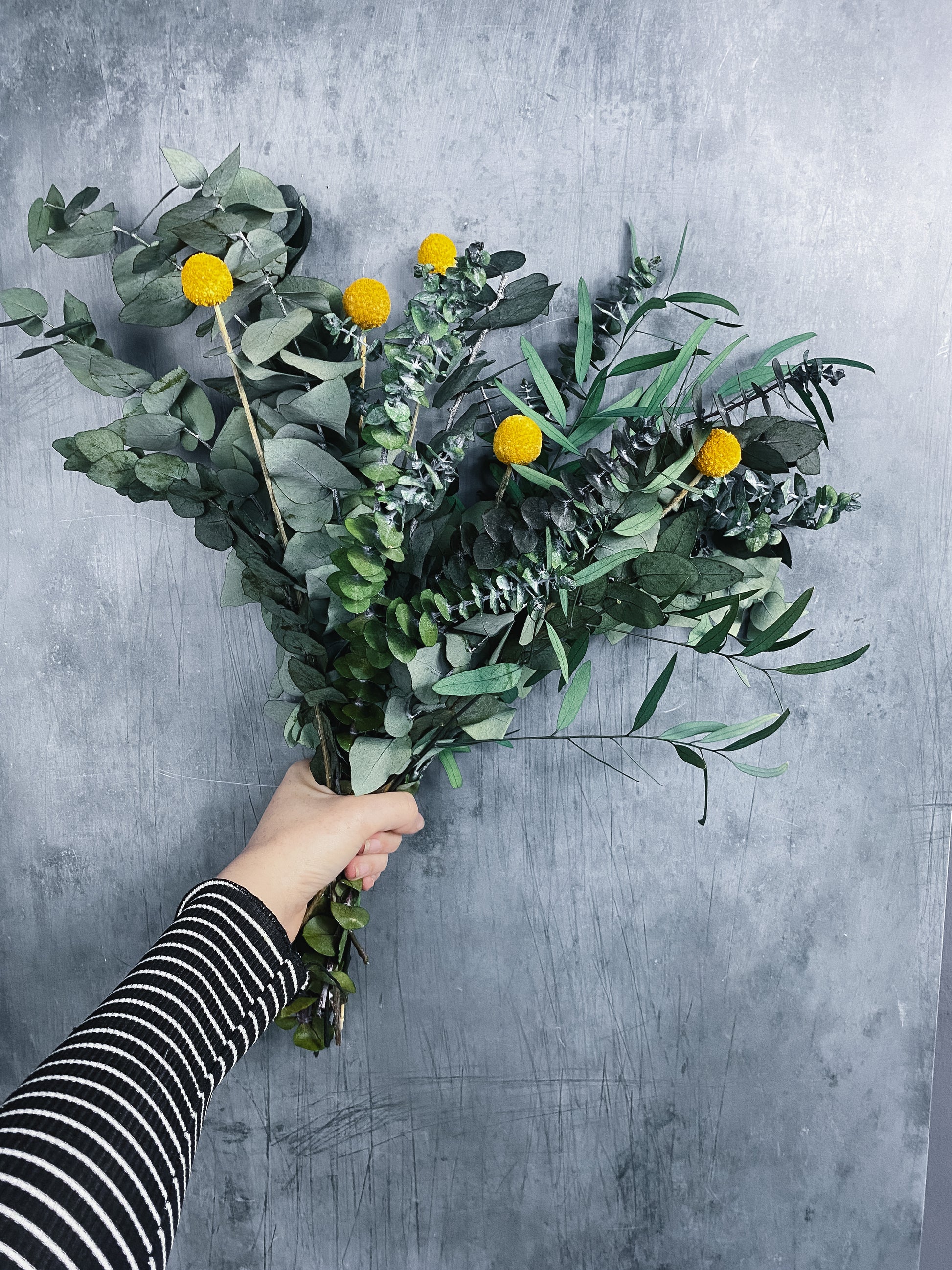 A brand new preserved flower arrangement for summer, Belle combines a mix of lush, fresh look preserved eucalyptus with a pop of yellow from those lovely billy buttons.
