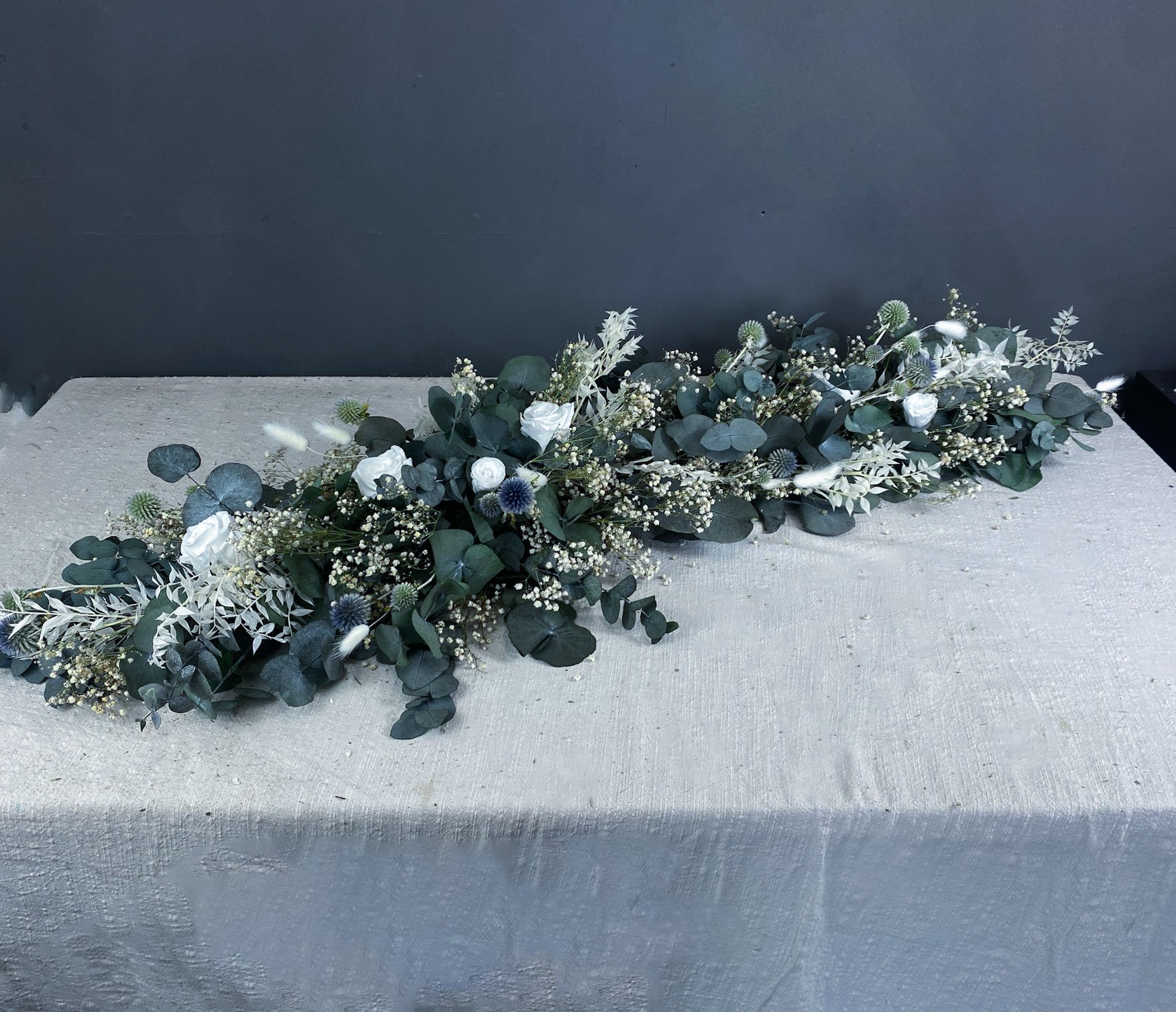 In stunning shades of greens, whites and blues, the Laurel dried flower garland brings a real wow factor to your top table and can also be moved to decorate your venue throughout the day.