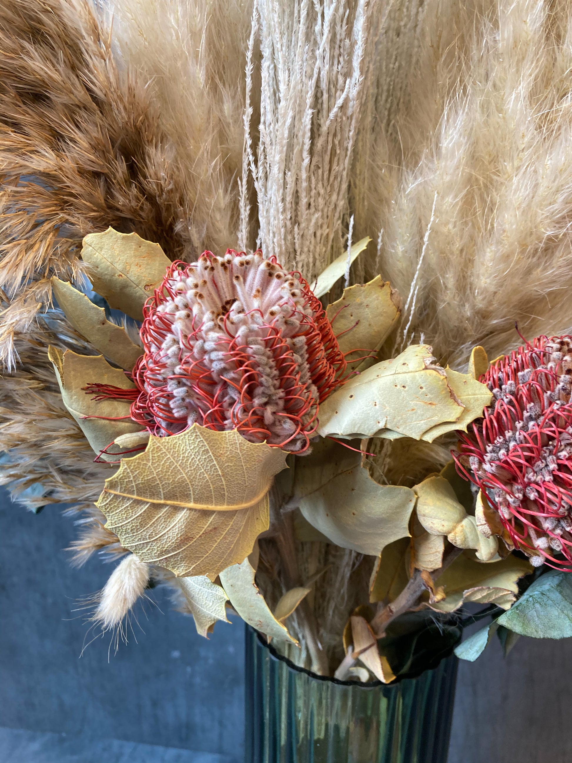 Sienna features a variety of lovely fluffy dried pampas grass, broom grass, preserved eucalyptus and two stunning banksia flowers.Â