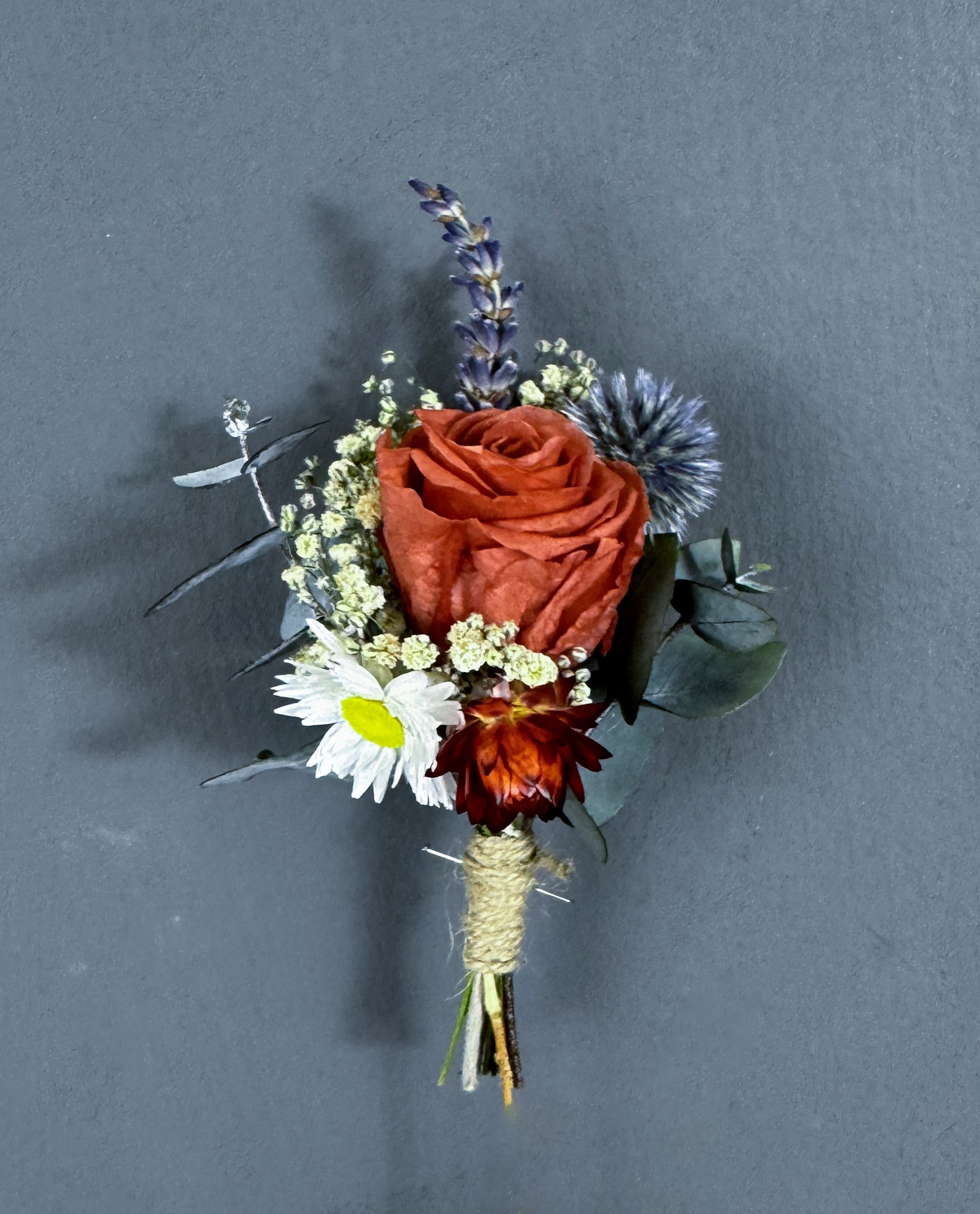 A gorgeous dried flower buttonhole that will wow on the big day and can be treasured for years after.