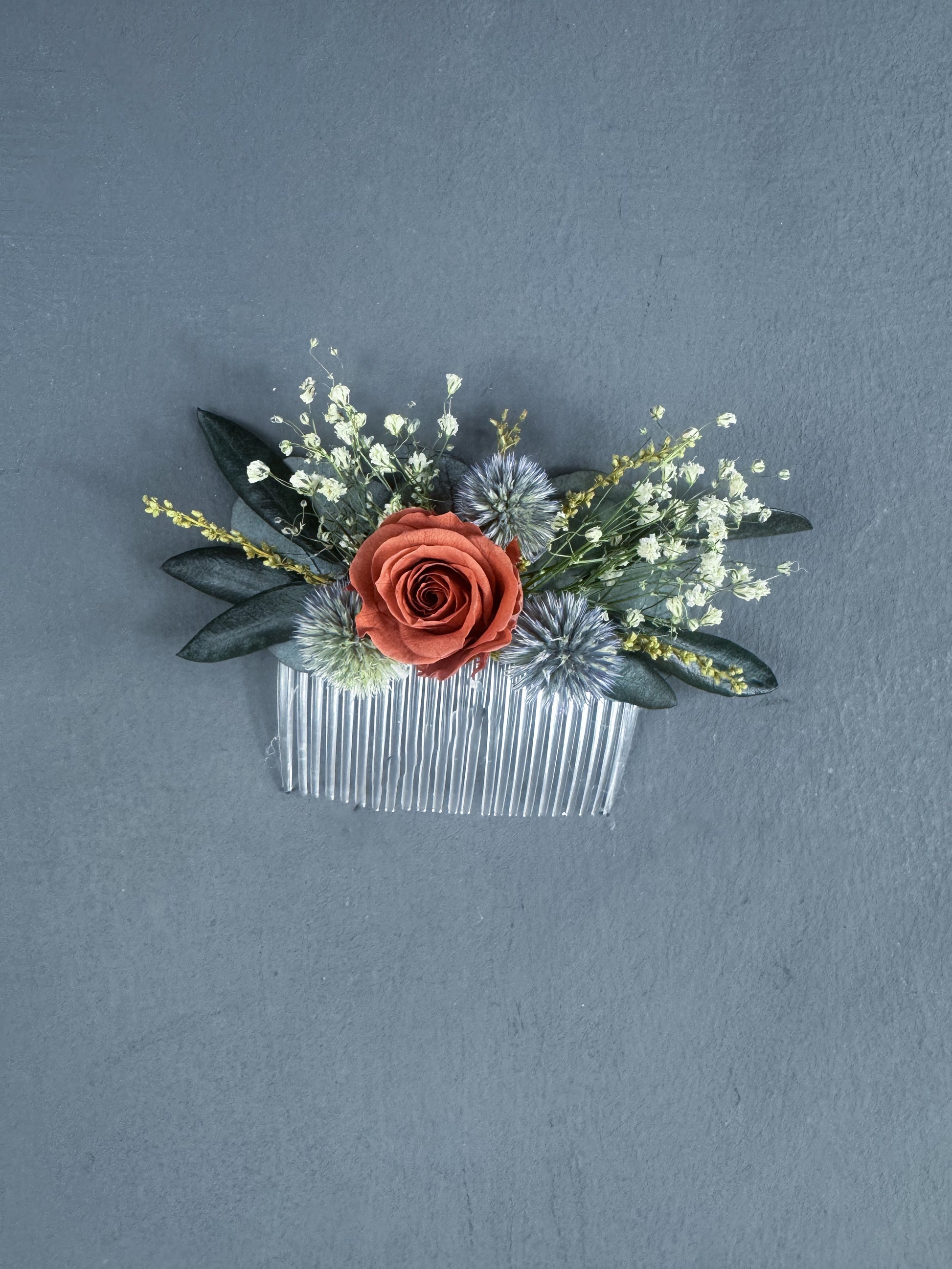 Designed to add a soft, romantic accent to your bridal or bridesmaid hairstyle, the Penny dried flower hair comb blends a beautiful mix of preserved and dried flowers in greens, whites, burnt orange and blues.