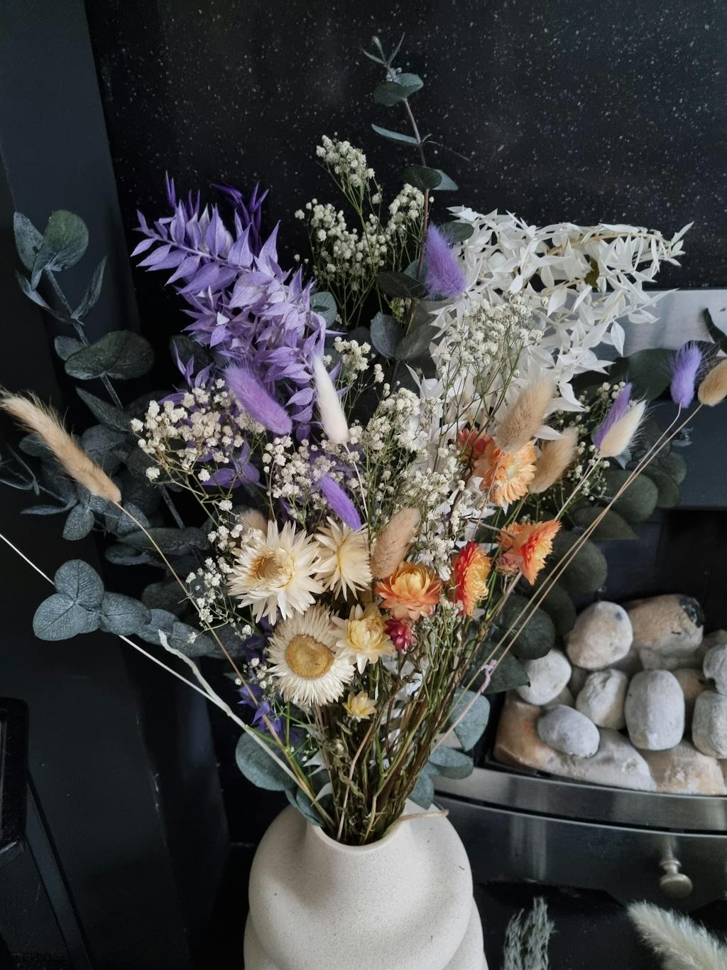 In stunning shades of purples, oranges, peaches, naturals, whites and greenery, Tayla features all the stunning dried flowers including preserved gypsophila, eucalyptus, helichrysum flowers, phalaris, bunny tails and broom bloom.